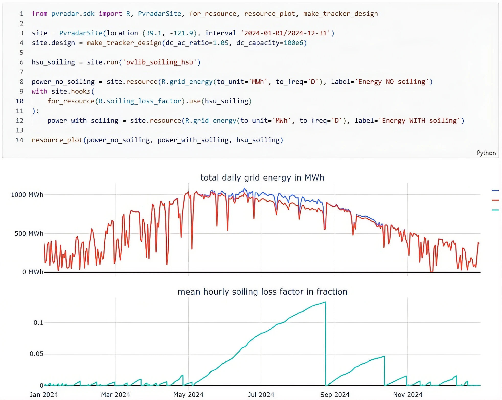 - Model libraries, including wrappers around pvlib models as well as specialized models for batteries, soiling, snow, and custom logic