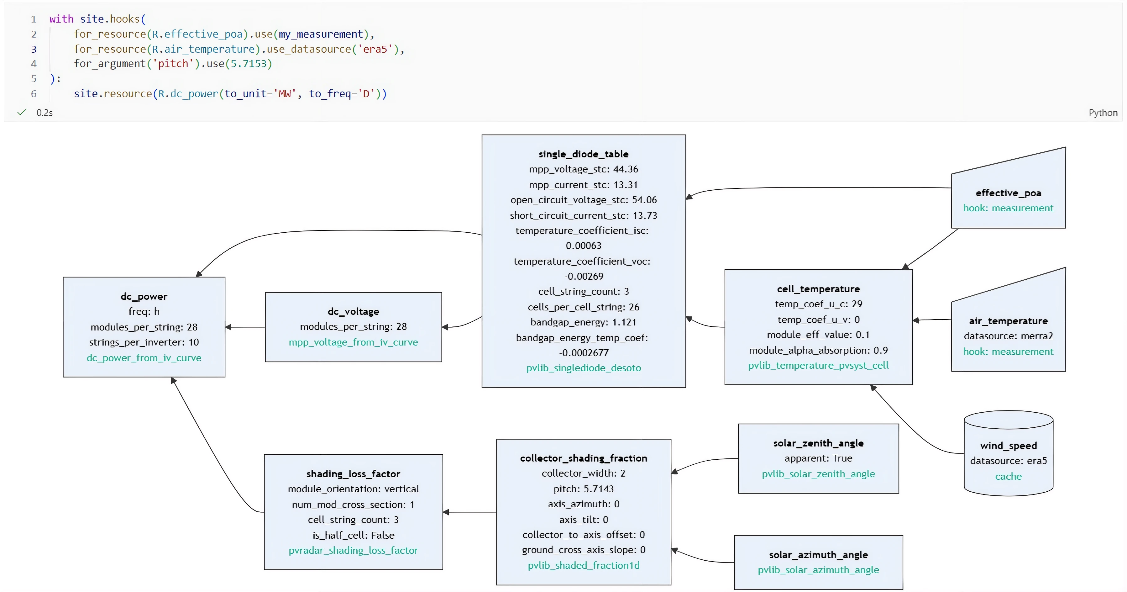 - User-defined models can easily be combined with models from pvlib or PVRADAR into tailored model chains to answer the question at hand.